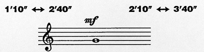 A usual time-bracket is made of three parts : a fragment of one or many staves, lying under two time intervals, one on the left and one on the right. The time intervals consist of two real-time values separated by a two-way arrow (fixed time-brackets, wherein the time intervals are replaced with single real-time values, may also be found in the Number Pieces}. The staves contain one or more sound events without any duration indications. A typical time-bracket is shown below.